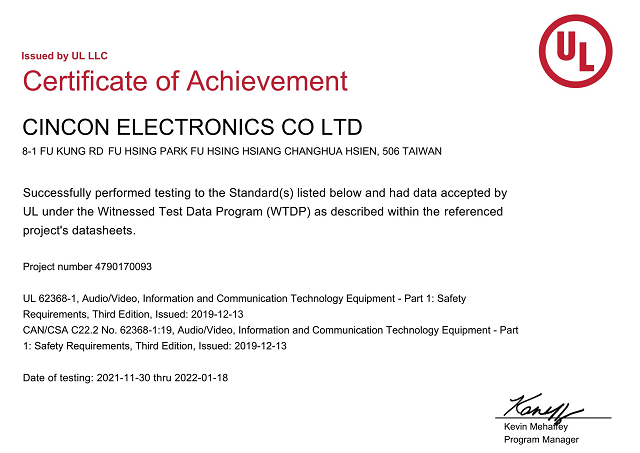 Cincon is excited to announce that our test laboratory has been accredited by UL under the Witnessed Test Data Program (WTDP). More products will be certified by this program based on the standards of UL 62368-1 and CAN/CSA C22.2 No. 62368-1:19 Safety Requirements.